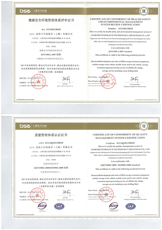 2014年4月28日,安洁士通过北京三星九千认证中心健康安全环境管理体系评审证书、质量管理体系认证证书(简称HSE)。此次认证主要包含安洁士的DQS污水处理设备、移动式污水作业车、移动式废弃泥浆作业车、污水处理剂的研发及销售、油田含油污泥过程处理服务及污水(含废弃钻井液)处理服务等石油环保系列产品与服务。