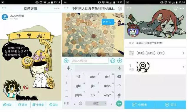 JuJu的产品,提供COSPLAY、动漫、展会、游戏、同人、小说、声控等图片信息的发布及互动讨论,社区氛围浓厚。目前,JUJU积累了200万用户,DAU在20万左右,主要集中在95年前后,亦有部分00后使用者,女性用户占6到7成。