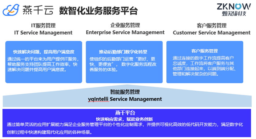 甄知科技核心产品燕千云帮助企业构建数字化服务能力,成为企业数字化转型的核心服务平台。具体而言,燕千云低代码平台支持三大服务管理场景,包括IT服务管理(ITSM)、企业服务管理(ESM)、客户服务管理(CSM),并将智能服务能力贯穿三大业务场景,进行AI赋能。