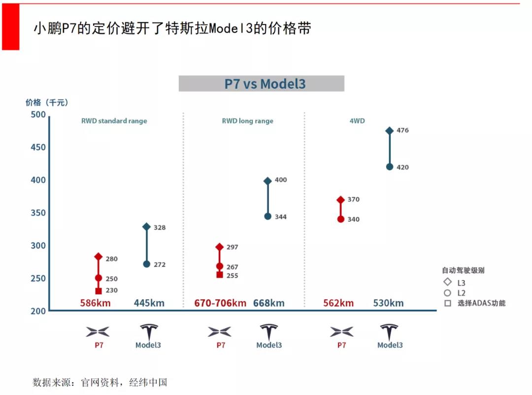 不过,P7的定价其实比特斯拉国产版Model 3更低,虽然Model 3最便宜的版本是28万,但只有黑色座椅和黑色外观,想要有任何改动都需要加钱,最终落地往往需要30万以上。而小鹏P7的定价在23万-34万,其实避开了特斯拉的价格段。