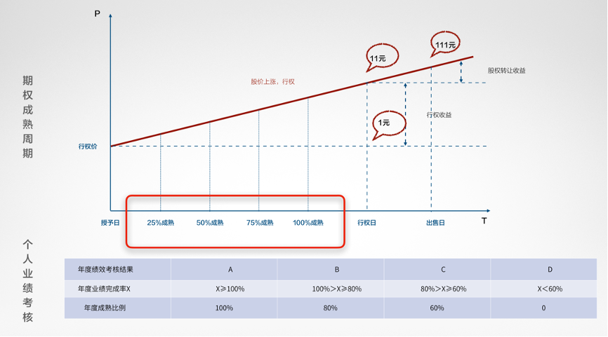 以上是针对联创及核心团队的经验,对于员工期权来说,也同样要保证确定性、动态性和回撤机制。首先在思维上,一定要明确业绩奖励和激励的区别,奖励是面向历史,激励是面向未来。奖励面向历史是指,就像年终奖是到年底发今年的,这就意味着当发给员工的那一刻起,已经没有激励效果了,因为它已经是历史。而激励是指,对员工未来干得好可能获得什么,但现在还没有得到,是要在未来去争取。