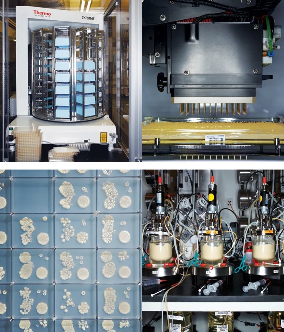 Amyris的加州实验室:通过机器人选择酵母菌株作为测试培养物,并分析数千种菌株将糖转化为金合欢烯的能力,有希望的菌株在小型发酵罐中进一步测试。图片来源:Fastcompany